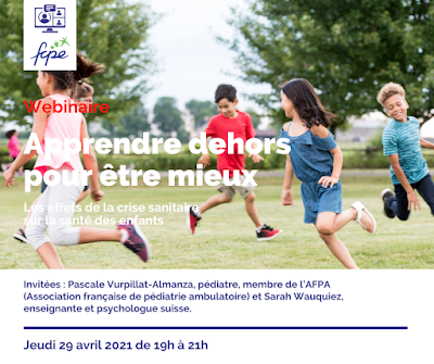 Apprendre dehors pour être mieux. Une des solutions pour répondre au malaise des jeunes durant la crise sanitaire est d'organiser l'école dehors. Dans ce webinaire organisé jeudi 29 avril de 19h à 21h par la FCPE les intervenantes expliqueront en quoi les besoins fondamentaux des enfants sont malmenés par la crise sanitaire. Une solution à mettre en œuvre en urgence pour remettre les enfants d'aplomb sera ensuite présentée : aller dehors pour jouer et apprendre. Ce rendez-vous en ligne est réservé aux adhérent.e.s FCPE. Inscrivez-vous vite auprès de formation@fcpe.asso.fr, la jauge étant de 100 personnes maximum.